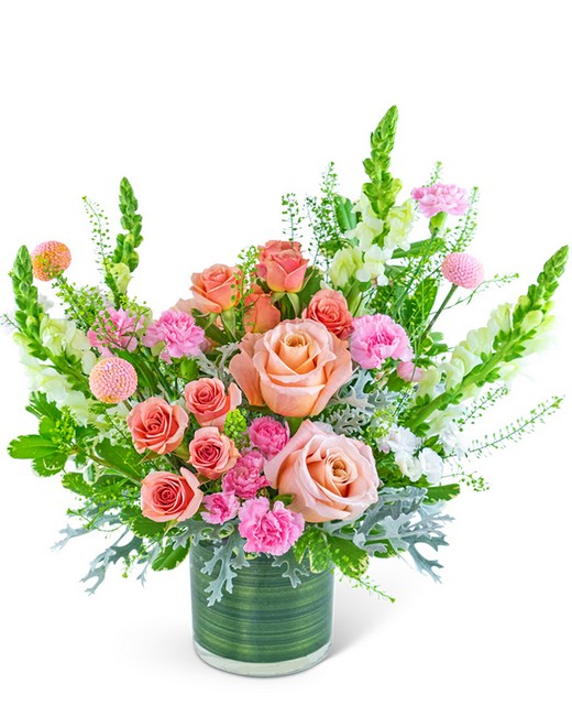 Capture the essence of romance with Rosy Coral Sundance, an enchanting flower design that brings together the delicate colors of pink and peach. This elegant arrangement features a stunning mix of Roses, Carnations, Solomio, Craspedia, Snapdragons, and premium foliage that complement each other perfectly. Presented in a leaf-lined cylinder vase, Rosy Coral Sundance is guaranteed to delight any recipient and add a touch of warmth and beauty to any space.